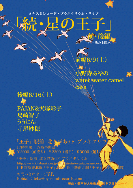 よい子のみなさんこんにちは。好評のオヤスミレコード・プラネタリウム・ライブ「星の王子」、今回は「声に出して読む」です。満点の星の下で奏でる音楽、聞こえるコトバのコラボレーション秋の大三角形が。もちろん雨天決行。よい席はお早めに…… |